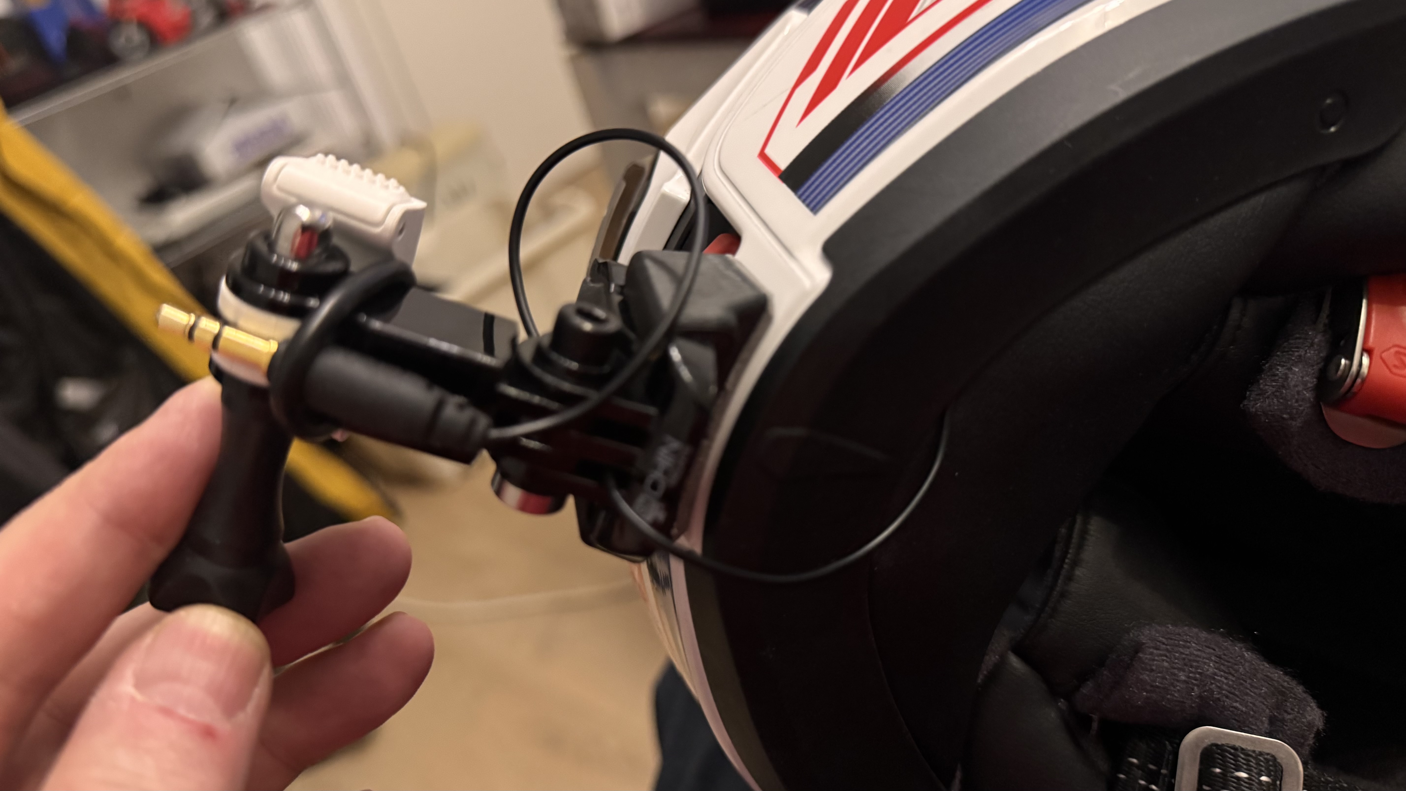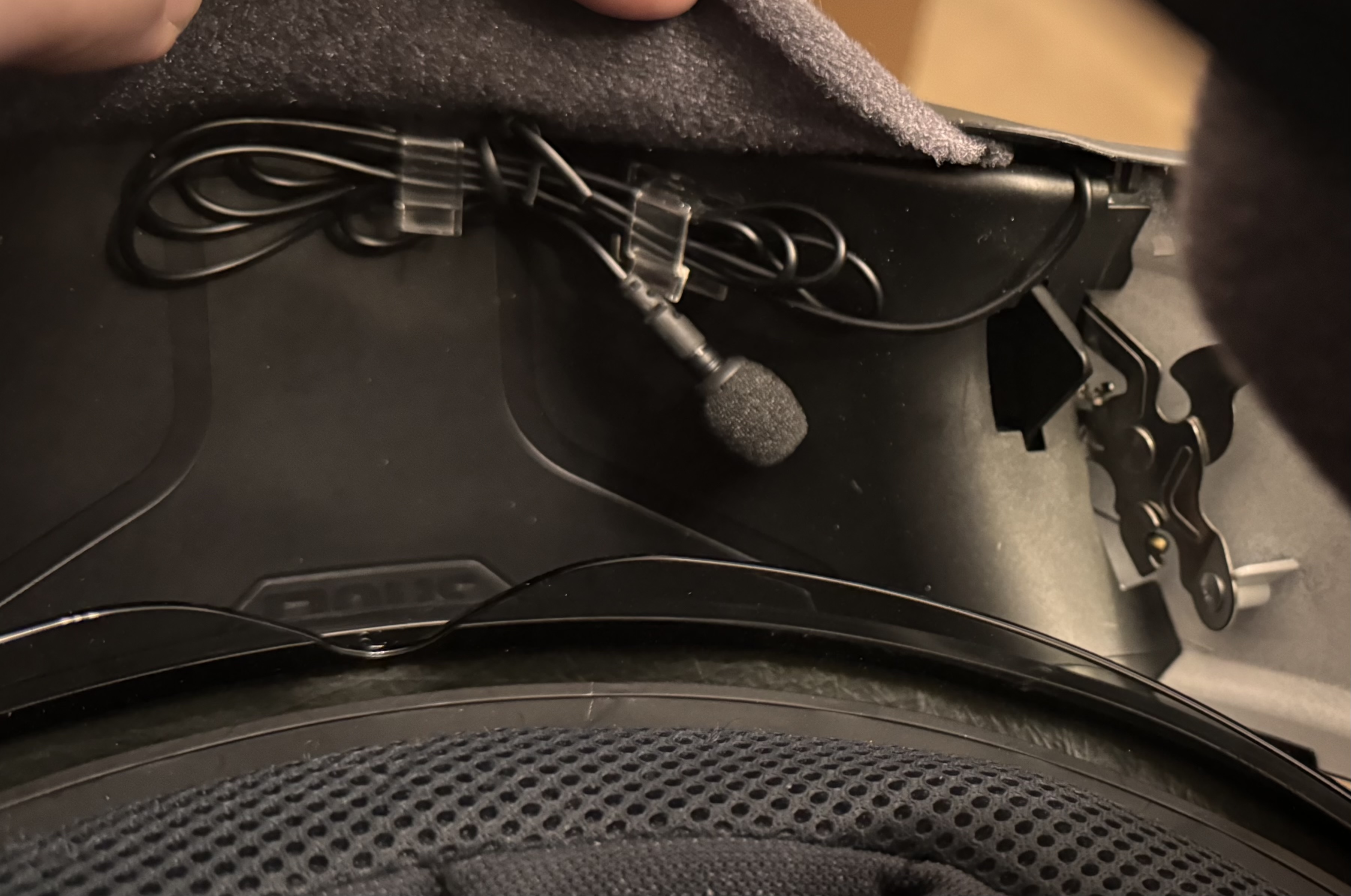 Als Mikrofon am Mund setze ich auf ein "RØDE Lavalier GO". Die Montage im Klappteil des Helms war recht einfach. Das überflüssige Kabel lässt sich mit ein paar Plastik Kabelhaltern gut verstauen und der Kabelweg selbst durch die Verkleidung ist mit ein paar Handgriffen gemacht.