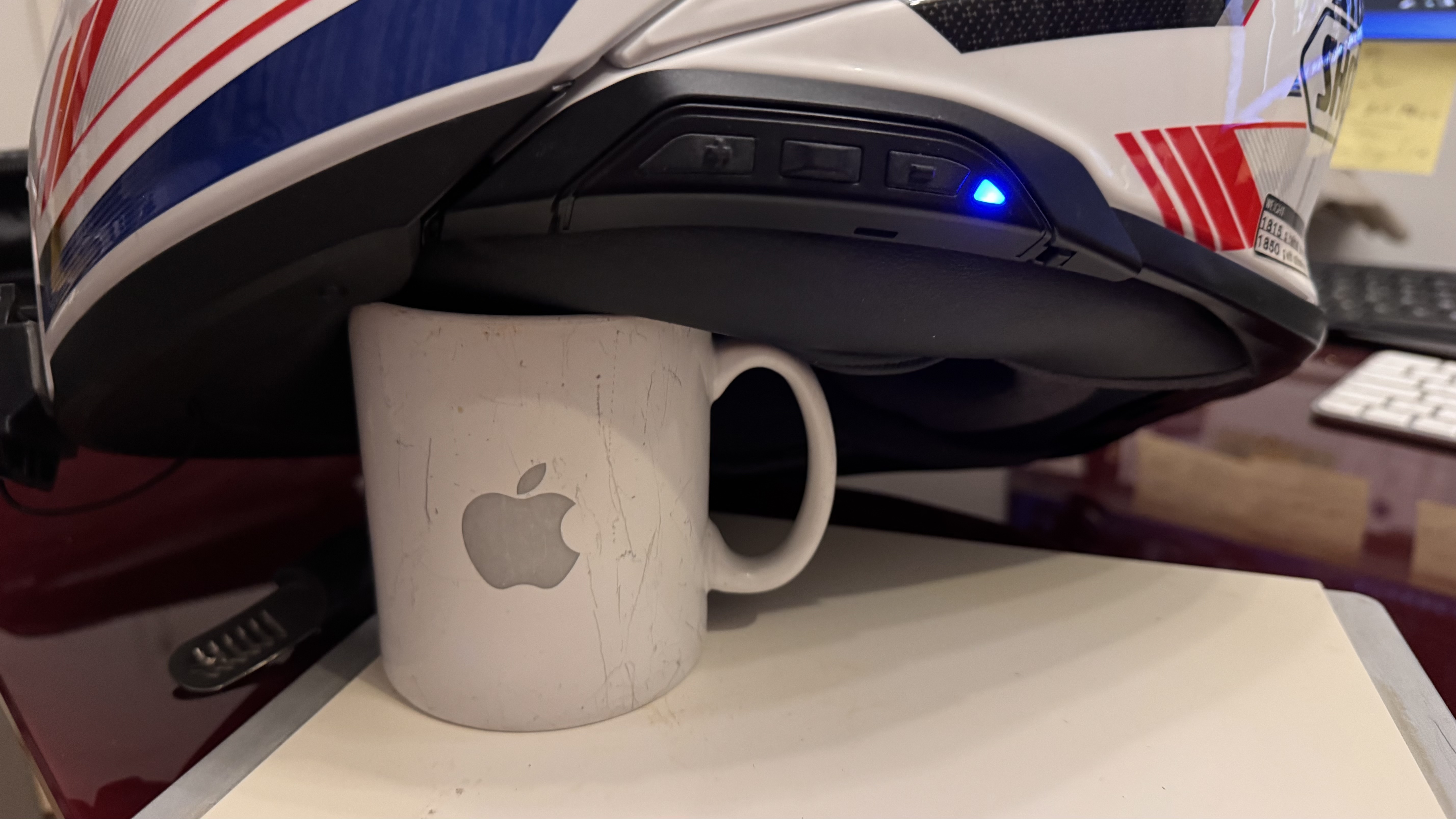 Für die Kommunikation ist in meinem Helm ein Sena SRL3 verbaut. Dazu gibt es eine Fernsteuerung auf dem Molle Pad des Tankrucksackes.